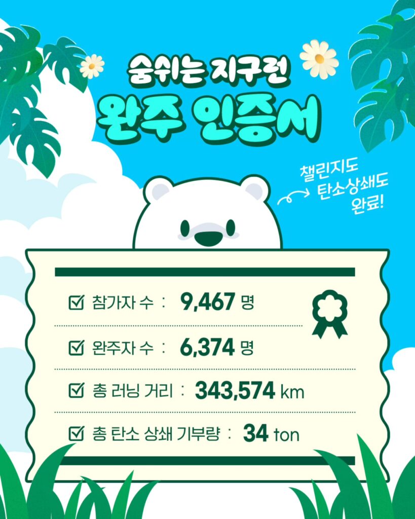 최종 집계 결과, 총 9,467명이 챌린지에 참여했으며 참가자들의 누적 러닝 거리는 343,574km를 기록했다. 이는 지구 둘레를 약 8.5바퀴 돈 것과 맞먹는 거리다.